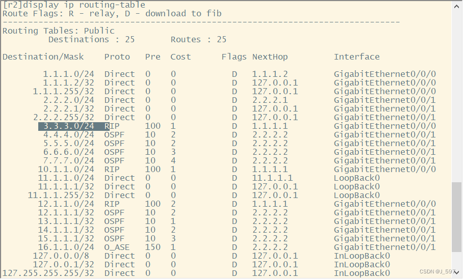 此时,R3的环回被R2学到的是两个不一样的网络号,左边是重发布到RIP掩码24位,右边是OSPF学到的是掩码32位