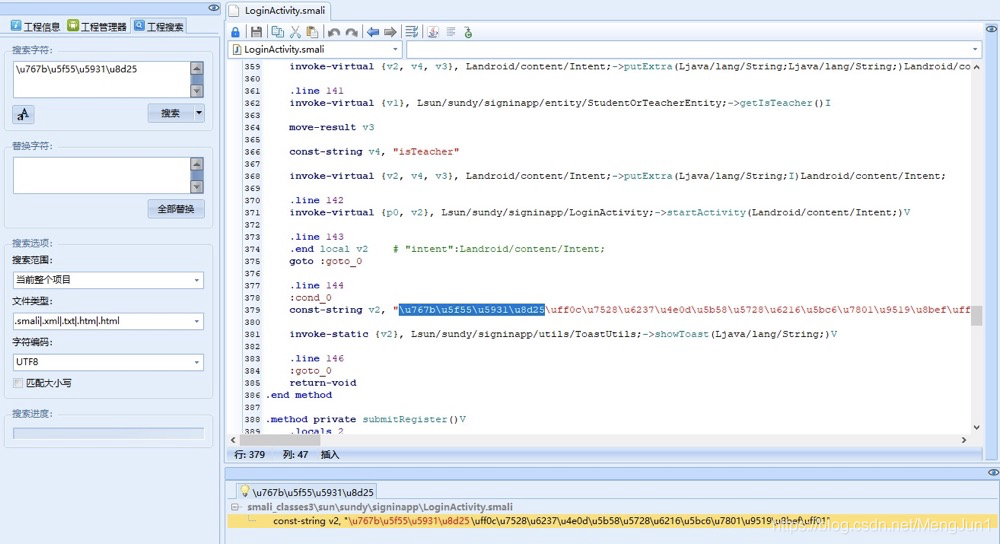 可以看到点击登录按钮后,如果密码错误,会提示登录失败,对应的Unicode码是\u767b\u5f55\u5931\u8d25,