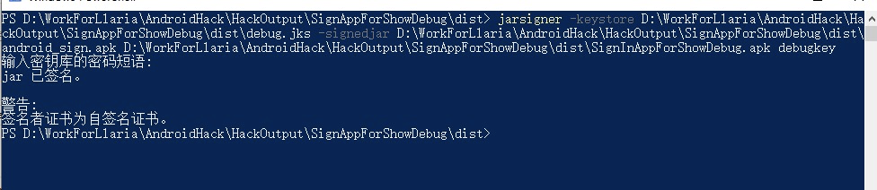 jarsigner -keystore D:\WorkForLlaria\AndroidHack\HackOutput\SignAppForShowDebug\dist\debug.jks -signedjar D:\WorkForLlaria\AndroidHack\HackOutput\SignAppForShowDebug\dist\android_sign.apk D:\WorkForLlaria\AndroidHack\HackOutput\SignAppForShowDebug\dist\SignInAppForShowDebug.apk debugkey