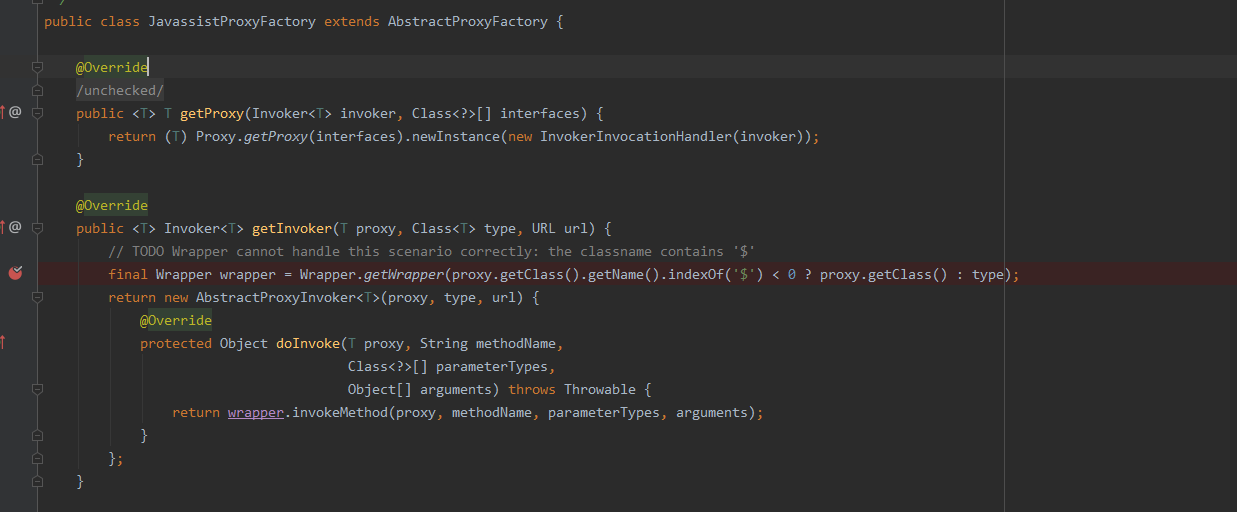 ProxyFactory类的ExtesnionLoader加载器在实例化JavassistProxyFactory对象时,会对JavassistProxyProxyFactory实例加上StubProxyFactoryWrapper装饰,其目的是利用装饰器模式来实现AOP的功能。