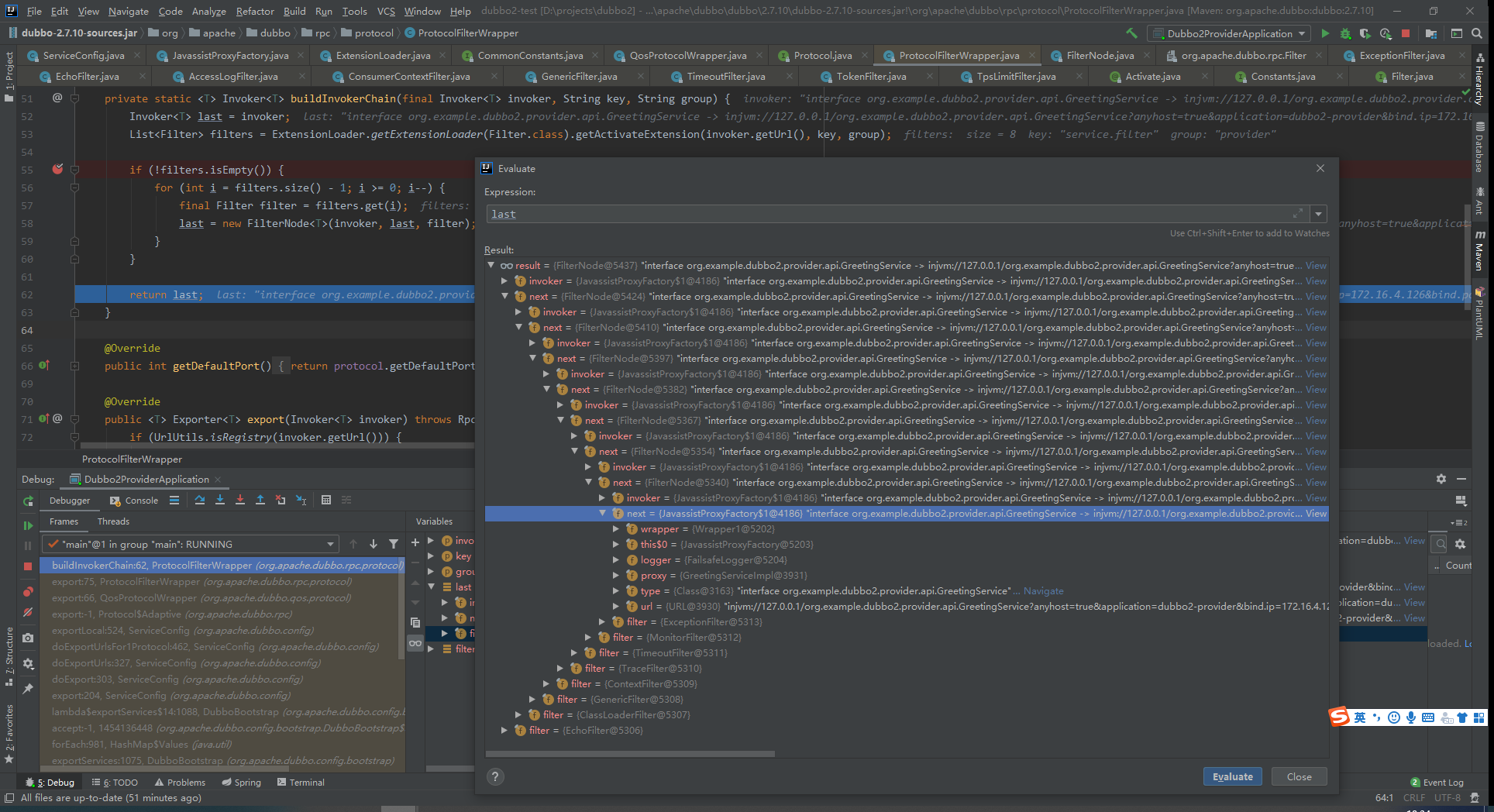 7 = {ExceptionFilter@5313} 对invoker进行过滤器链包装,FilterNode链如下图所示