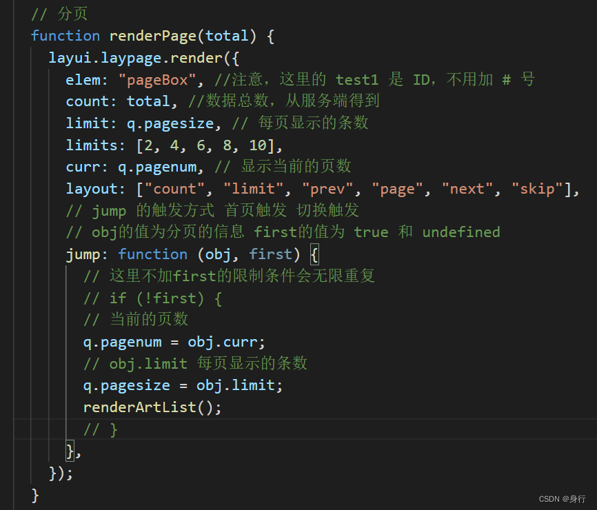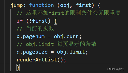 由于jump回调函数中在一进入页面也会执行渲染页面的函数,这就会造成死循环。可以借助jump回调函数的first属性的特点,第一次进入页面为true,切换页面时为undefined的特性,限制第一次进入页面再次执行渲染页面函数。