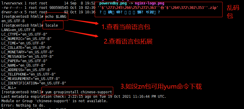方法二、语言包切换方法,使用【echo $LANG】命令查看当前语言包。估计八成是en的英文包,然后使用【locale】查看服务器上是否有英文包,如果有切换即可。如果没有需要使用【yum groupinstall chinese-support】命令下载,如果ping不通外网可手动上传语言包。