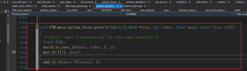 往cloth_calc_force函数里面深挖,可以找到将重力累加到合力的函数。