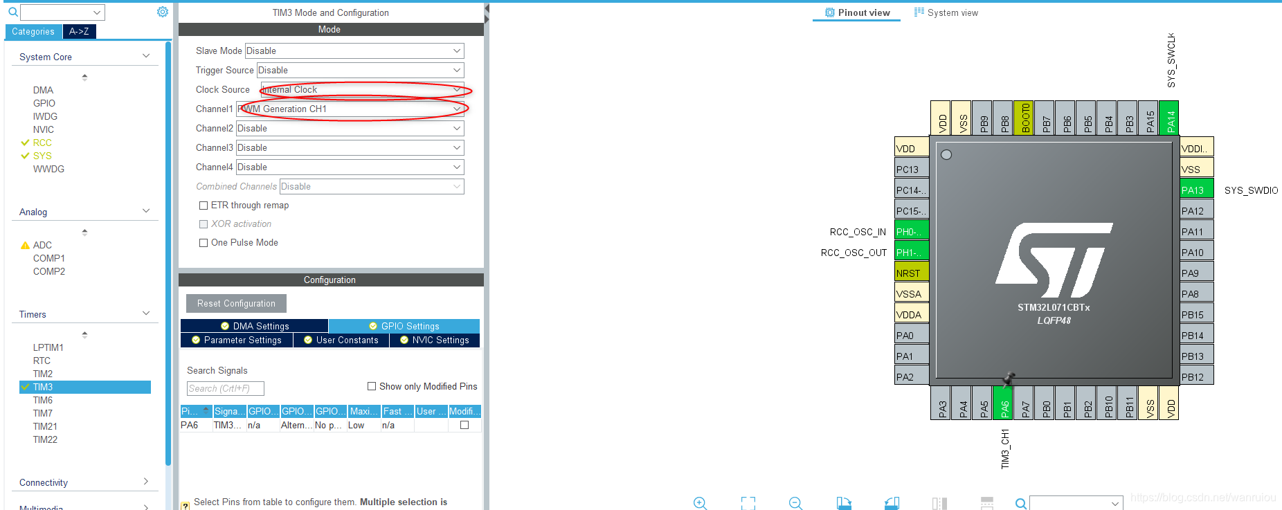 如图所示,将PA6引脚配置为定时器3并将通道1作为PWM输出