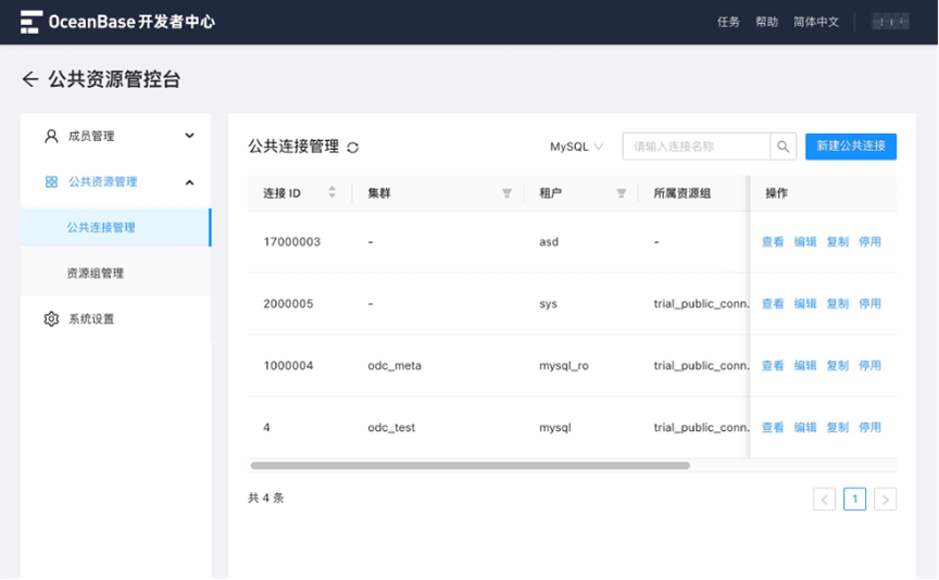 2. 连接管理:提供 OceanBase MySQL 模式服务。支持用户创建数据库连接和保存创建的连接信息,同时提供一键复制和删除连接的能力。