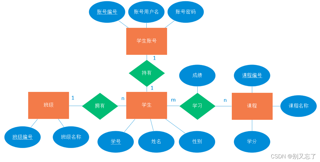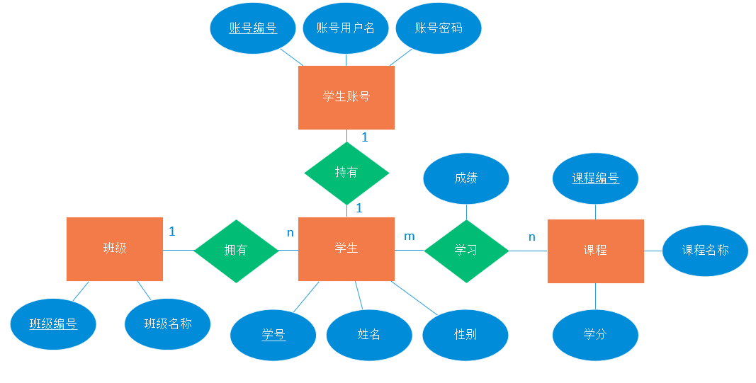 其中矩形表示的是实体(班级,学生,课程,学习账号),椭圆表示的是属性,菱形表示的是联系(拥有,持有,学习)。