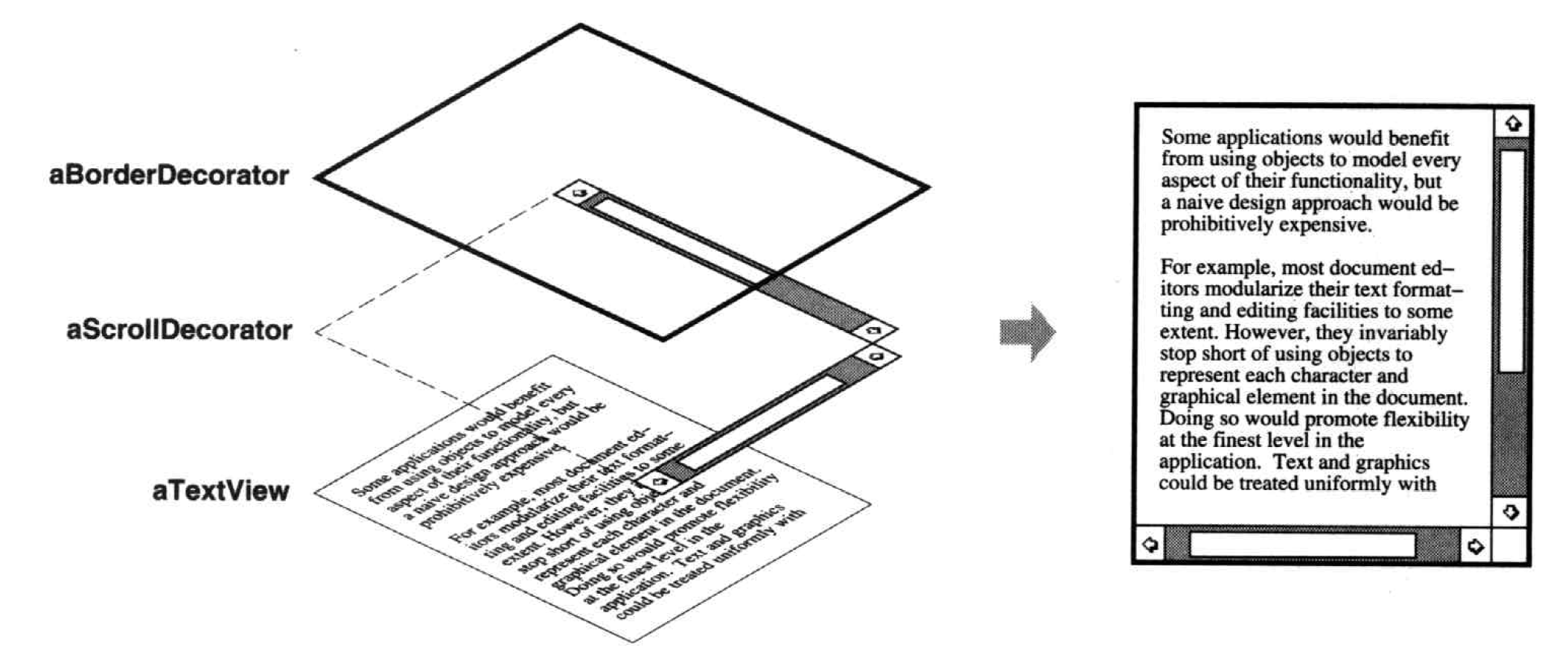 比较灵活的方式是将组件嵌入到另一个对象中,由这个对象添加边框。我们称之为装饰。这个装饰与它所装饰的组件接口一模一样,因此对使用该组件的客户透明。在请求转发给这个组件的时候,可以在转发前执行一些额外的动作,比如画一个边框,透明性的使用可以递归的嵌套多个装饰,从而添加任意多的功能,如下图。