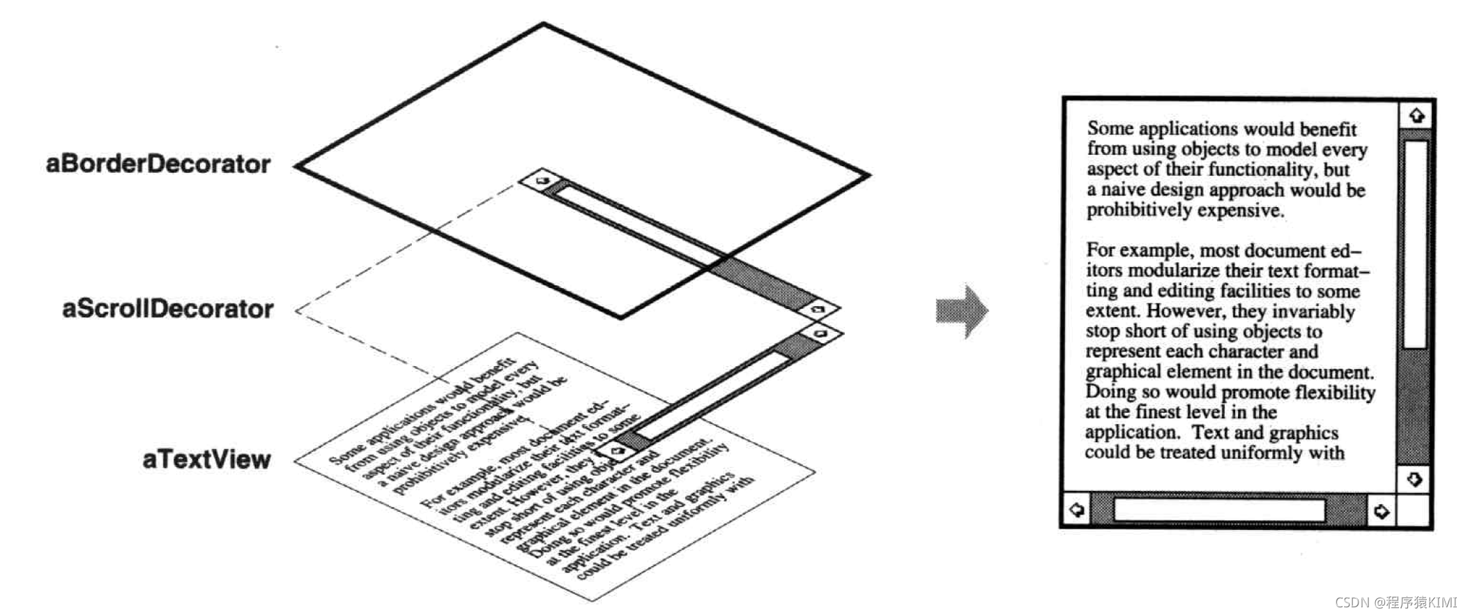 - 这种比继承更加灵活机动的特性,尽管对于那些了解这些系统的人来说,很容易对它们进行定制,但是很难学习这些系统,排错也很困难。对于多次装饰的对象,调试时寻找错误可能需要逐级排查,较为烦琐。
