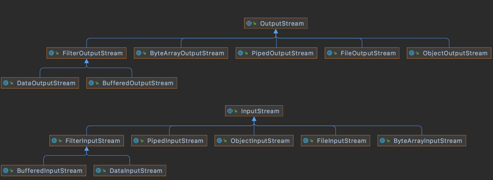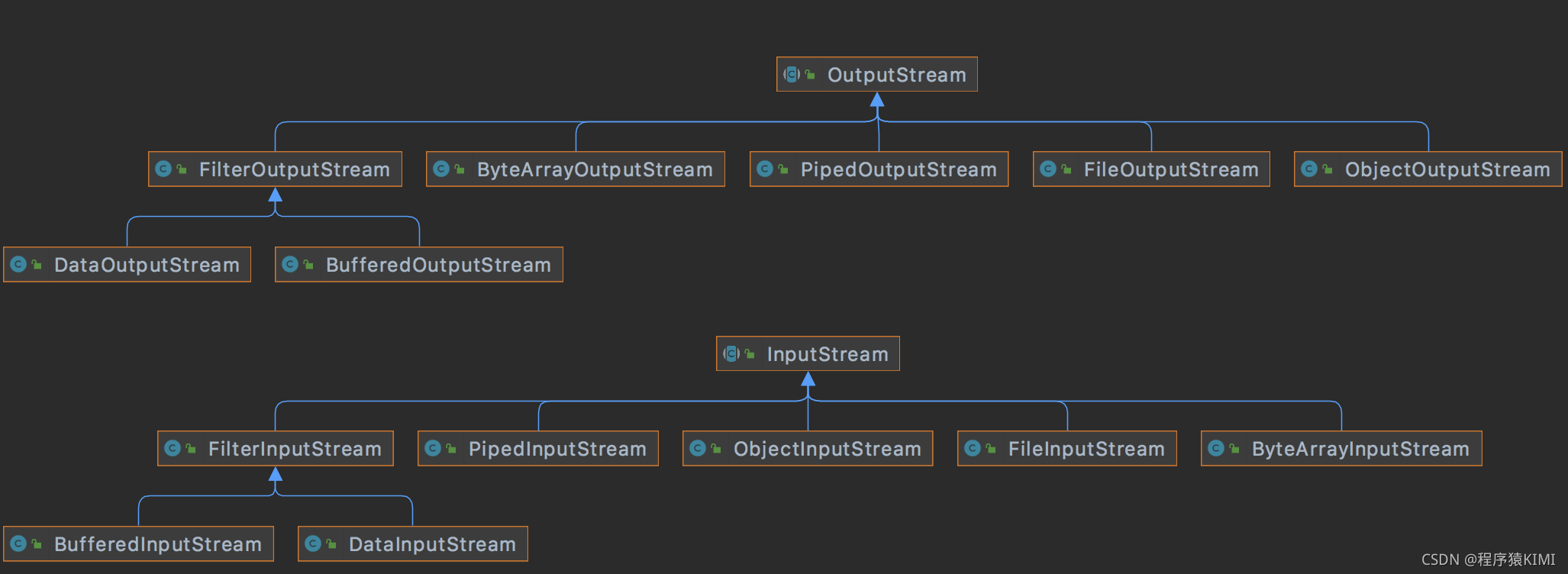先看一下类图,InputStream和OutputStream是抽象组件,下图中所有的类都是可以被包装的,还有一些类没有放过来。另外比如Writer、Reader都是一样的设计思想,只是一个是字节操作,一个是字符操作。但是这也有会有一个问题,就是类爆炸。