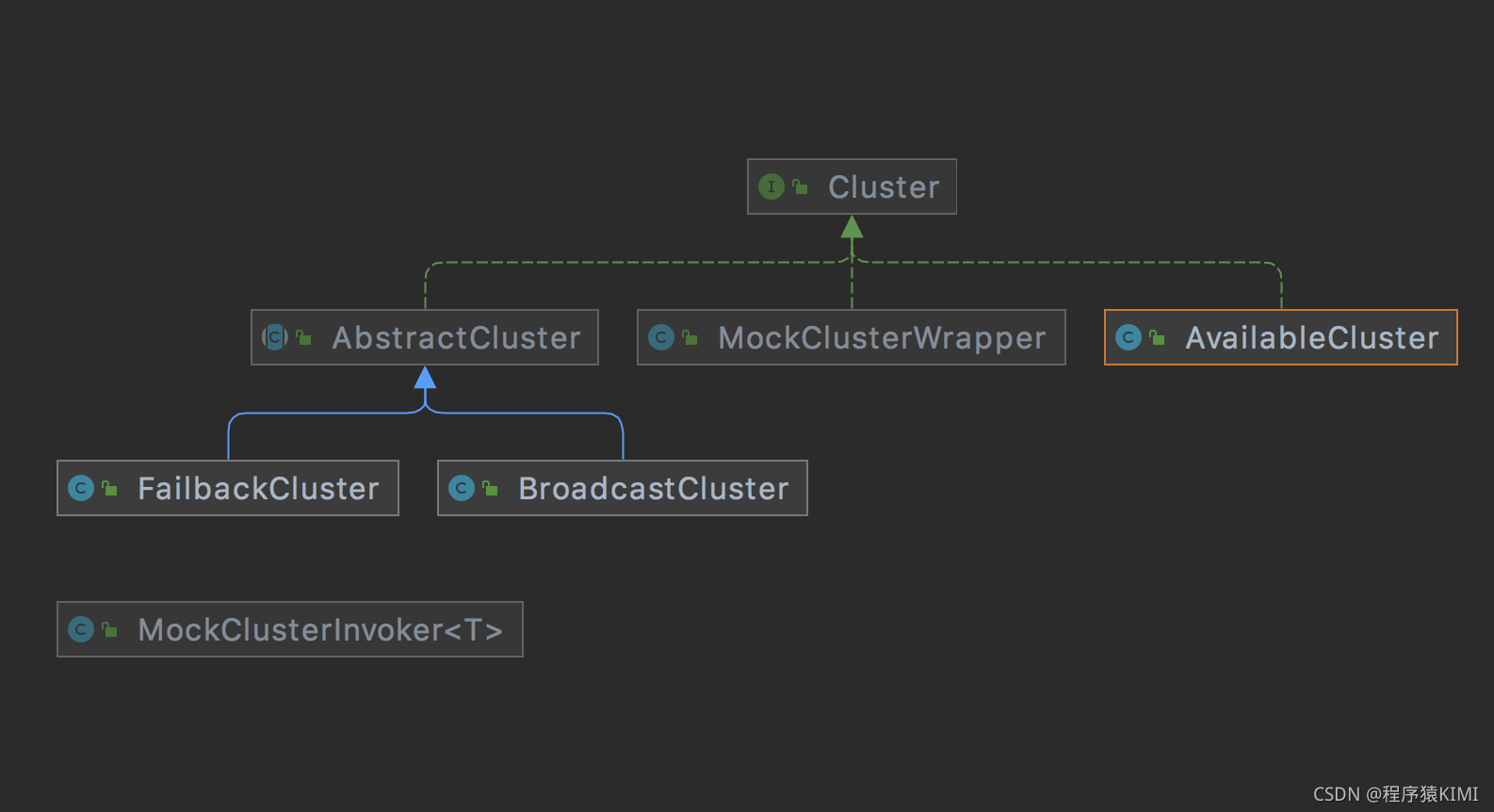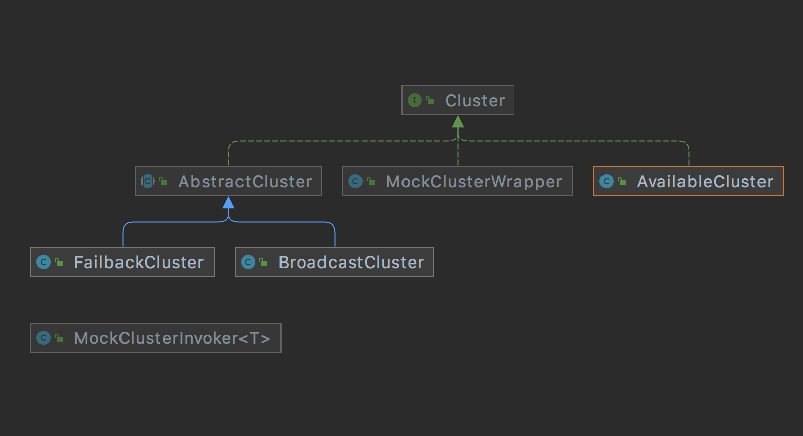 再举个例子,有时候在研发过程中,我们会发现环境毕竟痛苦,这时需要构造一些Mock类,来模拟真实的调用,这时,装饰器的作用就体现出来了。比如Dubbo中的核心类Cluster类,该类将Directory中的多个Invoker伪装成一个Invoker, 对上层透明,包含集群的容错机制。原始的Cluster有以下子类(省略了部分,比如常见的FailFast、FailSafe、FailOver)。而我们关注的是MockClusterWrapper类,这就是对Cluster进行了包装,并返回一个MockClusterInvoker,来进行一些mock操作。