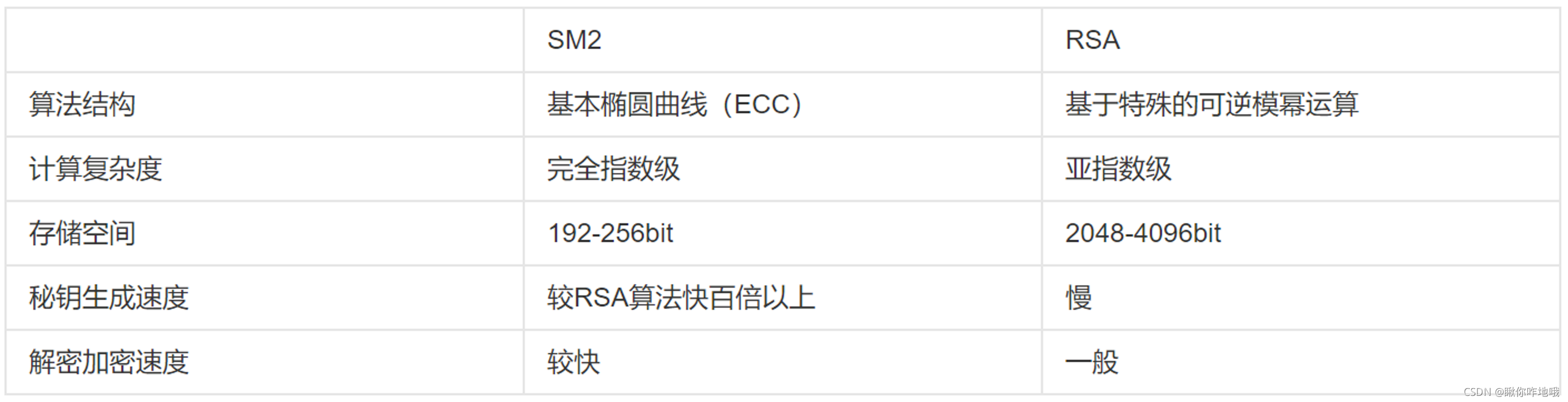 SM2采用的是ECC 256位的一种,其安全强度比RSA 2048位高,且运算速度快于RSA。