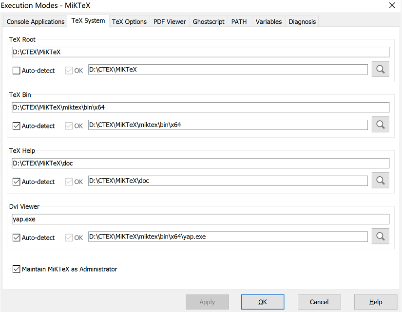 7. 打开WinEdt10.3,选择:Options->Execution Modes->TeX System,将你自己的MiKTeX安装路径D:\CTEX\MiKTeX写入TeX Root中,点击OK。
