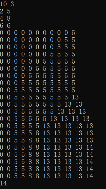 我输入了一个简单的情况,总容量只有10,菜品有三种,然后依次输入三道菜品各自的费用和评价值