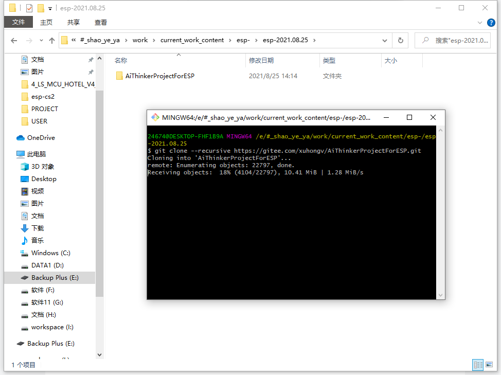 输入:git clone --recursive https://gitee.com/xuhongv/AiThinkerProjectForESP.git 点击回车他会自己下载到当前文件夹,