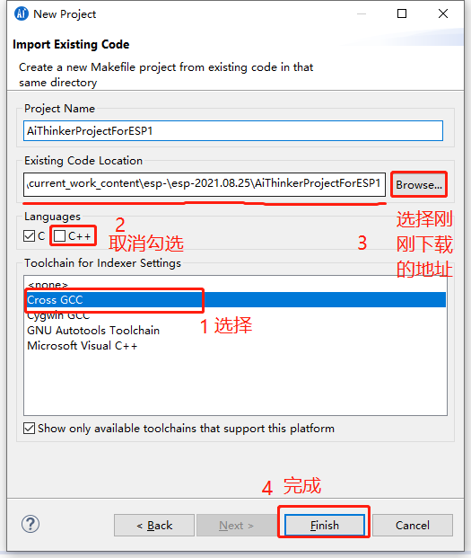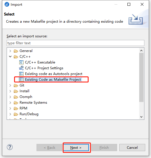 选择c/c++ -> Existing Code as MakfileProject 点击下一步