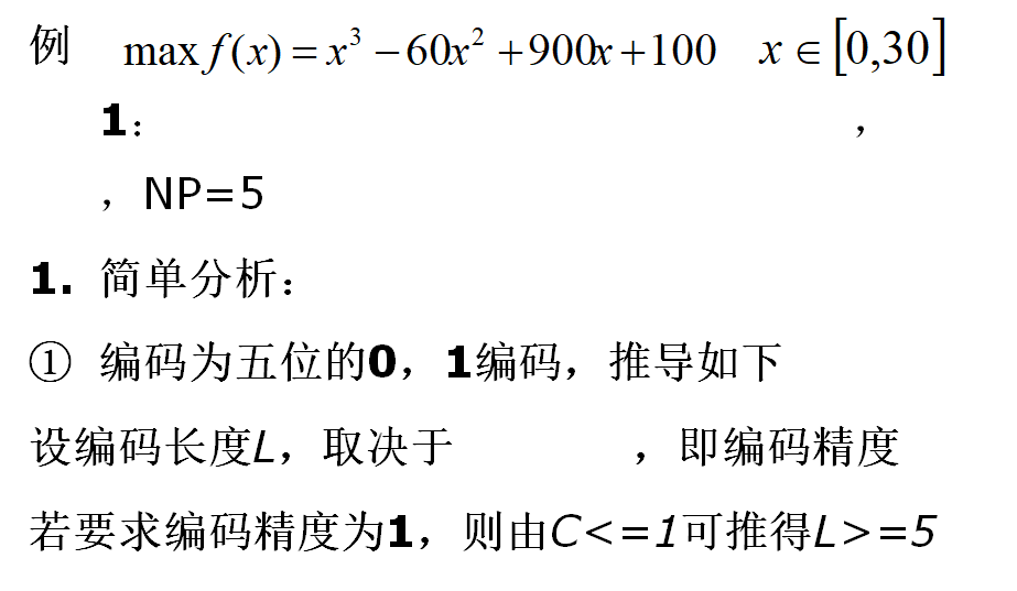 2、编码方法——二进制编码(用0,1字符串表达)。二进制适用于三种情况:背包问题+实时优化+指派问题。二进制编码缺点:编码长不利于计算;二进制编码优点:便于位值计算,包括的实数范围大。