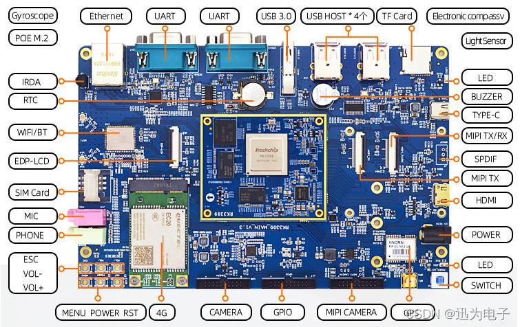 迅为iTOP-3399开发板平台均由核心板和底板构成,核心板的主要芯片有CPU,内存,EMMC,电源管理,EEPROM等,并且核心板兼容同一底板,使用我们的核心板以及操作系统,您只需要根据您的业务需求来开 发自己的底板和应用程序即可,让您从复杂的平台搭建的环境中脱离,加速您产品上线的时间。