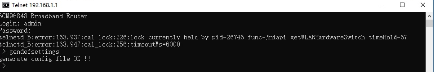 输入完账号密码后出现<的符号,再次输入gendefsettings 生成配置的备份文件,这一步非常重要。如果不操作在解密的时候不会出现超级密码。