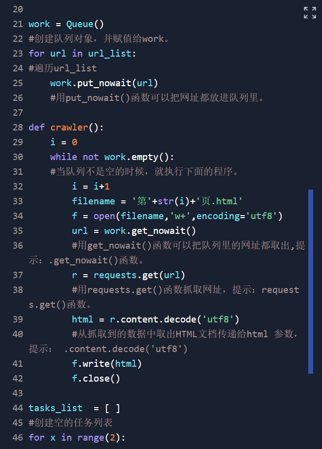 创建queue()队列对象(队列对象的作用就是将url全部添加到里面后,爬虫要爬取时才从队列队像里面拿一个网址出来爬取,故而可以达到调节一个爬虫崩掉后剩余的网址无法完成)