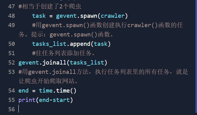 创建任务列表(普通列表)以此来存放任务,先用for循环来创建需要有多少个爬虫来执行,后用gevent.spawn()函数(参数为def函数)来创建执行某函数的任务,而后将结果赋给task后将task加入任务列表中→6.用gevent.joinall()去执行任务(参数为一个列表,就是所要执行的任务列表)