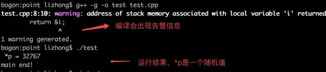 看看下面的例子,原本是想将fun函数中的变量i的地址返回给p,用p访问这个变量,这个打印出*p是32767,并不是变量i的值8。像这种bug,一旦在大的项目中出现是很难定位的。
