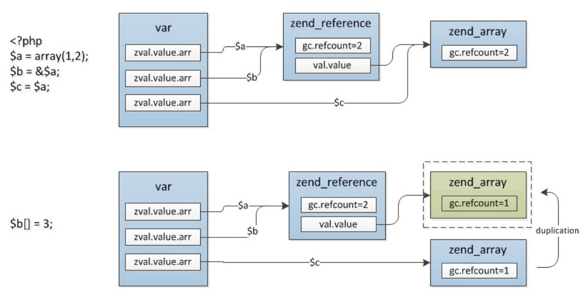 $b = &$a; //$a,$b -> zend_reference_1(refcount=2) ->zend_string_1(refcount=1)
