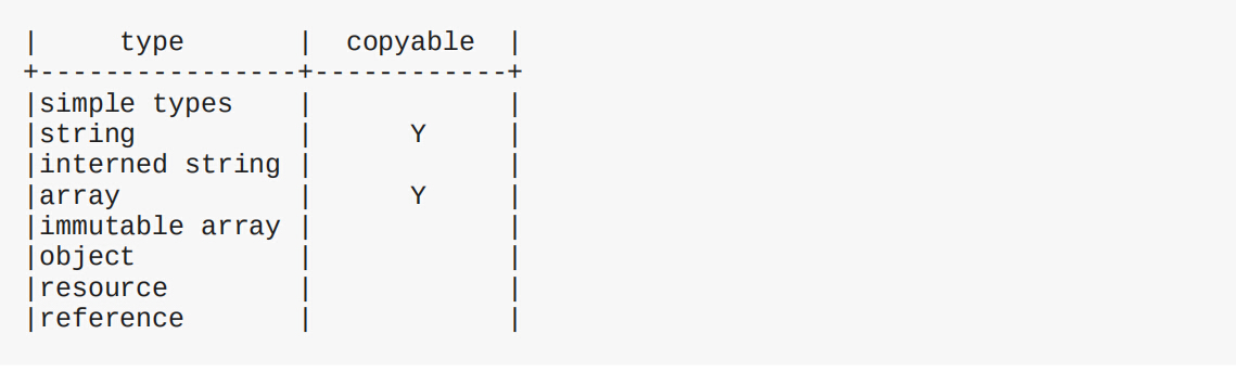不是所有类型都可以copy的,比如对象、资源,实时上只有string、array两种支持,与引用计数相同,也是通过zval.u1.type_flag 标识value是否可复制的: