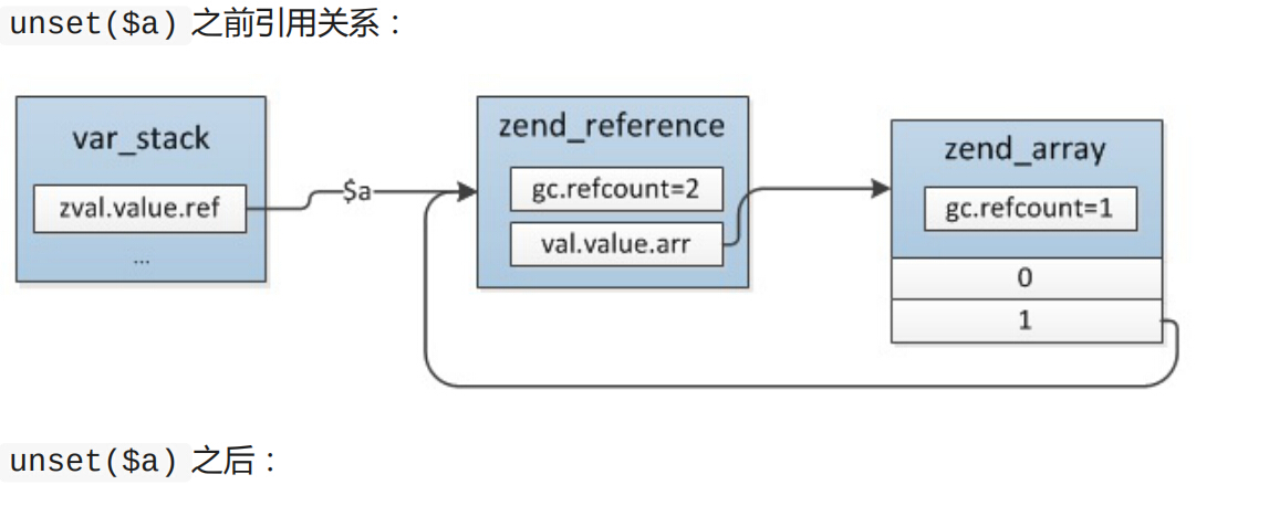 $c = &$b;/*或$c = &$a*/ //$a,$b,$c -> zend_reference_1(refcount=3) ->zend_string_1(refcount=1)这个也表示PHP中的 引用只可能有一层 ,不会出现一个引用指向另外一个引用的情况 ,也就是没有C语言中 指针的指针 的概念。