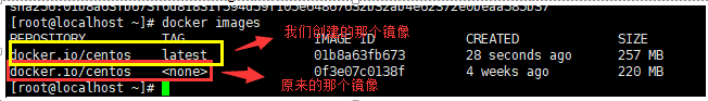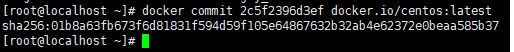 [root@localhost]# docker commit 2c5f2396d3f docker.io/centos:latest