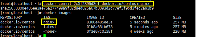 docker commit 2c5f2396d3f docker.io/centos:latest 这个命令中latest也可以才成nginx,就成了docker commit 2c5f2396d3f docker.io/centos:nginx ,这个是随便修改的。如下图:
