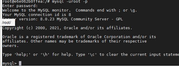 docker exec -it e6e062b0ffea bash进入容器后,运行以下命令,输入mysql密码