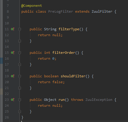 可以看到在继承ZuulFilter类时需要实现如下四个方法: