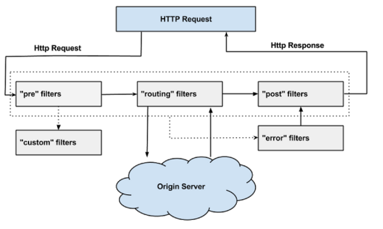 Zuul的核心是一组过滤器,而Zuul的绝大部分功能也都是通过这一组过滤器实现的。Zuul提供了对这些过滤器进行动态加载、编译以及运行的框架。这一组过滤器包括pre、routing、post、error等,通过一张图片来了解一下这些过滤器分别在一笔请求的哪些环节生效: