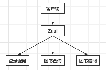 而其中,即使是非本校的学生也可以在客户端查询有哪些图书,但是只有登录成功的本校学生才能发起借阅。这时客户端需要做的事情就多了,既要区分不同的请求发往哪个服务,还要判断当前的权限是否可以调用这个服务。另外,在客户端进行权限的控制也存在安全隐患,前后端的职责划分也不够明确。在引入Zuul网关之后的效果是这样: