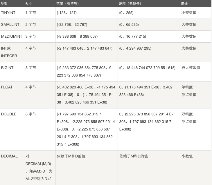 ======================================== tinyint[(m)] [unsigned] [zerofill] 小整数,数据类型用于保存一些范围的整数数值范围: 有符号: -128 ~ 127 无符号: 0 ~ 255 PS: MySQL中无布尔值,使用tinyint(1)构造。 ======================================== int[(m)][unsigned][zerofill] 整数,数据类型用于保存一些范围的整数数值范围: 有符号: -2147483648 ~ 2147483647 无符号: 0 ~ 4294967295 ======================================== bigint[(m)][unsigned][zerofill] 大整数,数据类型用于保存一些范围的整数数值范围: 有符号: -9223372036854775808 ~ 9223372036854775807 无符号: 0 ~ 18446744073709551615