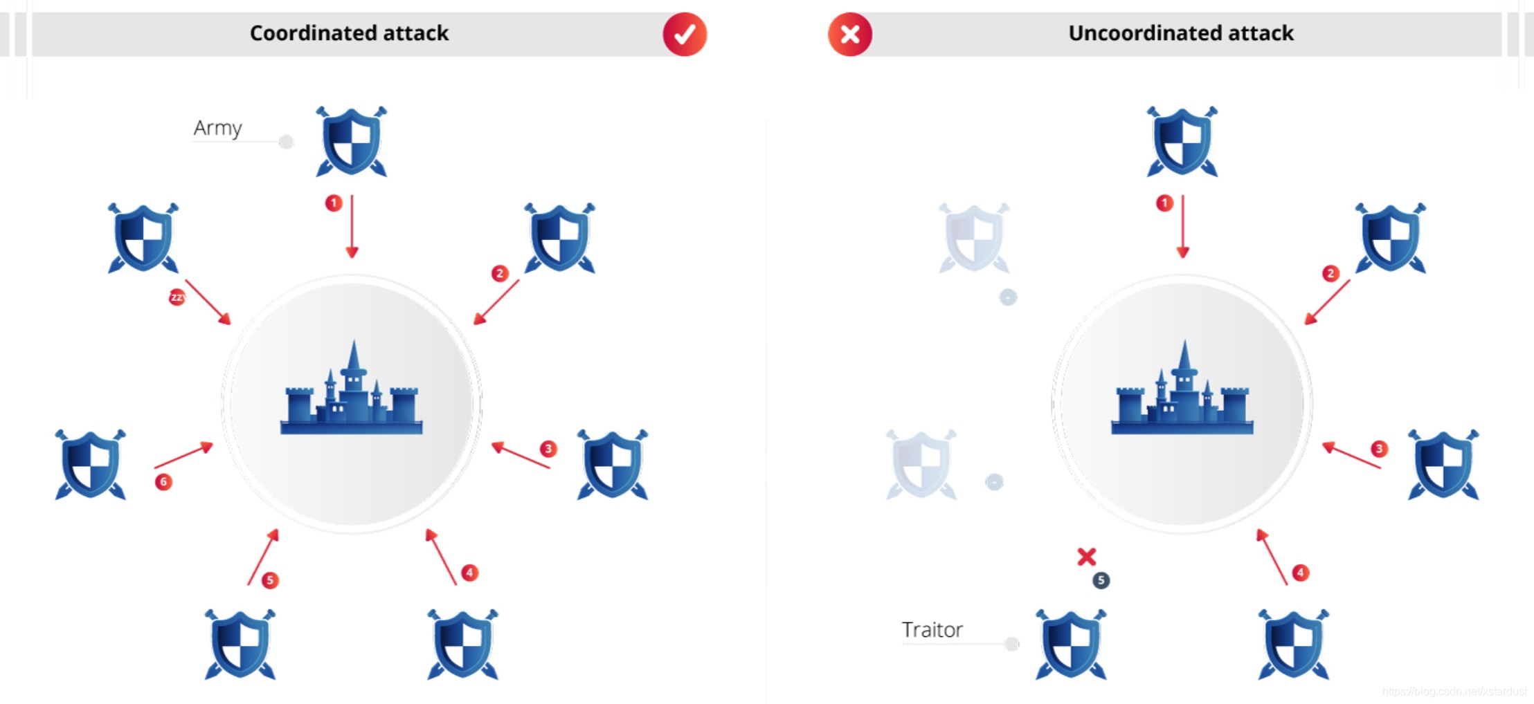 拜占庭这一称呼,源于Lamport最初的论文,可以说是分布式领域最复杂、最严格的容错模型。简而言之,n个将军准备一起进攻某个城堡,每个将军都可以选择进攻或是撤退,但所有将军必须行动一致才能成功。各个将军之间相隔很远,不能直接通讯,必须通过信使来传递消息。但是信使并不可靠,信使可能过了很久才送到消息、可能一直也没有把消息送到、甚至可能会故意篡改消息;而将军也并不可靠,里面可能存在叛徒,并不按照提案来行动。显然,这个故事中的信使用来代表分布式网络中的不可靠信道,而将军就是各个不可靠的节点。