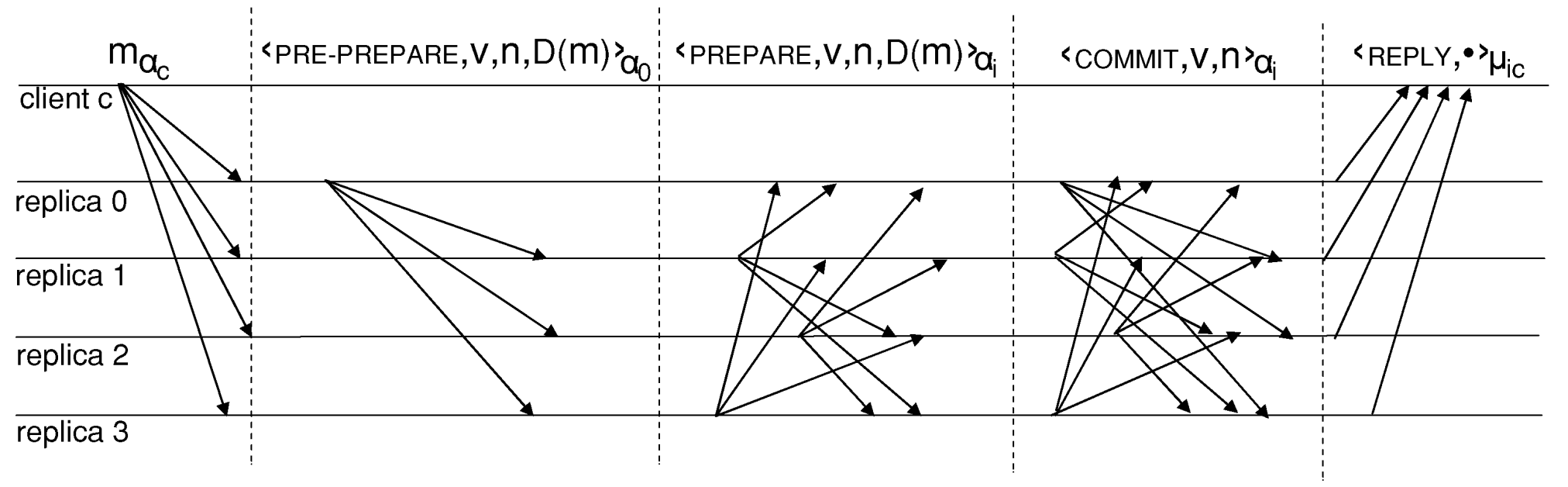 PBFT算法正常运作过程(http://www.pmg.csail.mit.edu/papers/bft-tocs.pdf)