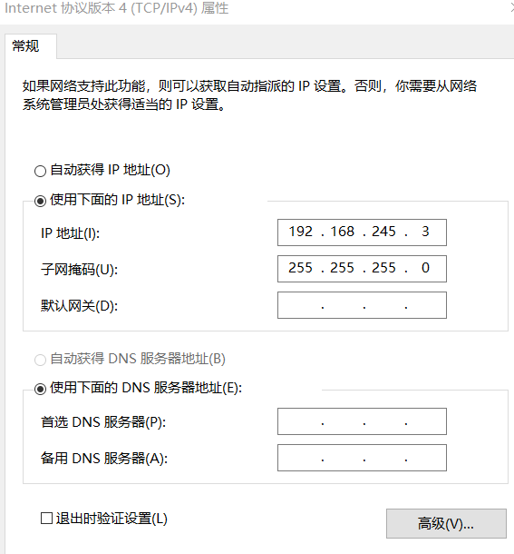 将vmnet1属性种的ip地址设置成手动地址,这个手动地址需要和虚拟机的频段相同:例如虚拟机设置为192.168.245.45,那么vmnet1的地址设置为:192.168.245.X,X可以是除了45的任意0~255间的数字。
