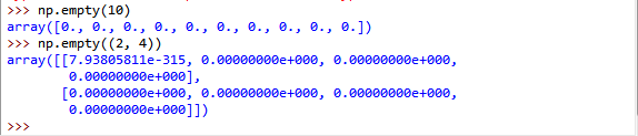 - 使用预定函数arange、ones/ones_ ike、zeros/zeros_ like、empty/empty_ like、flfull_/ like、eye等函数创建 #创建数组全为1,全为0,全为空,指定数值