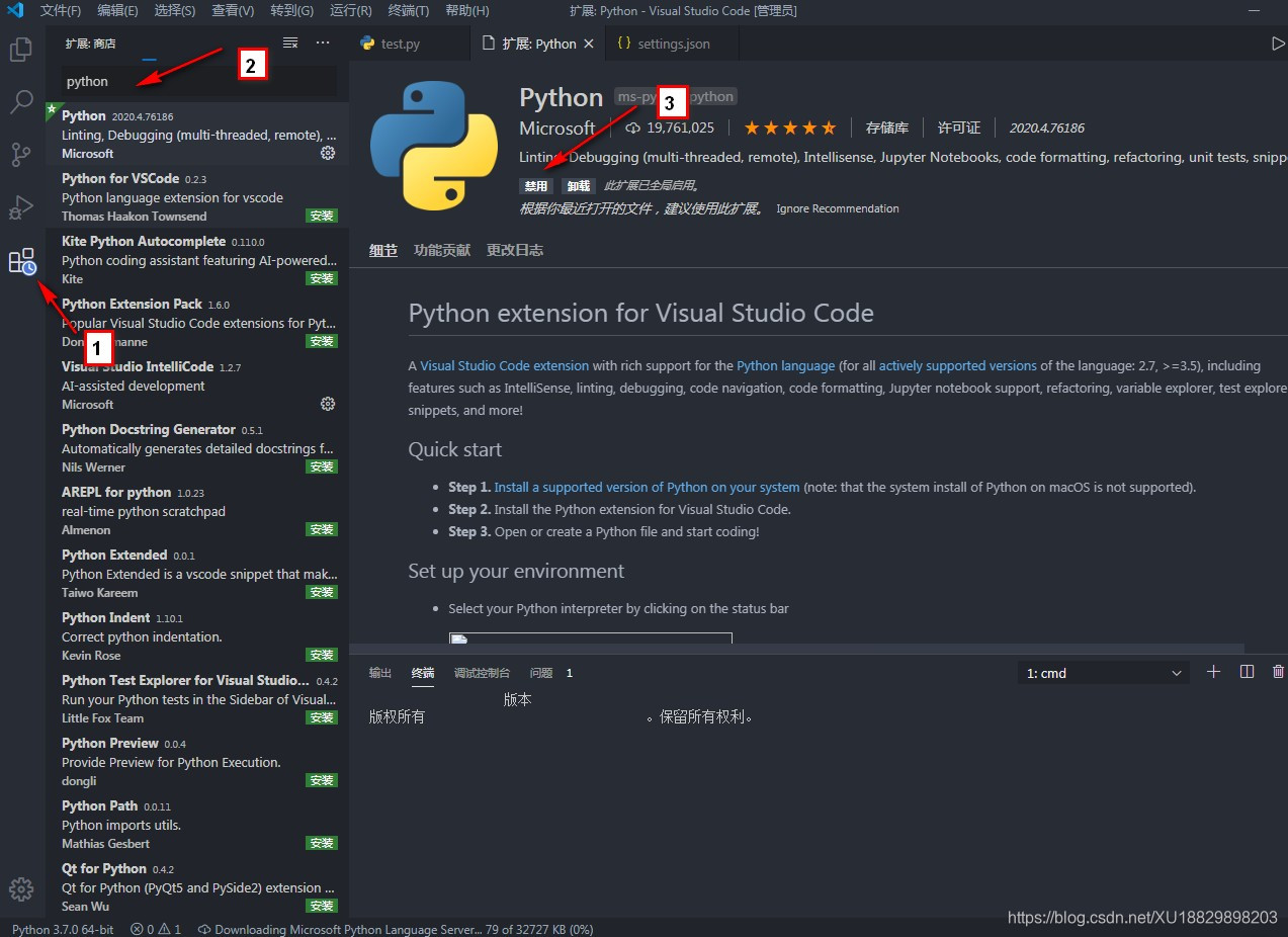 【1】在插件栏搜索【2】python 安装(安装好后如图3)