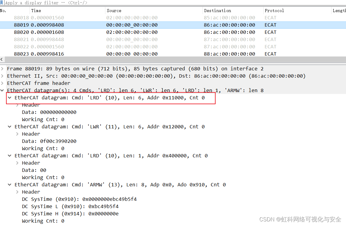 4、 过滤出周期性报文,使用该指令ecat.sub1.cmd == LRD && ecat.sub1.cnt == 0,过滤出子报文1为LRD且计算器值为0(表示从主站发出,未经过从站)的周期性报文,选择三角进行报文排序,可以是从小到大,或者从大到小。