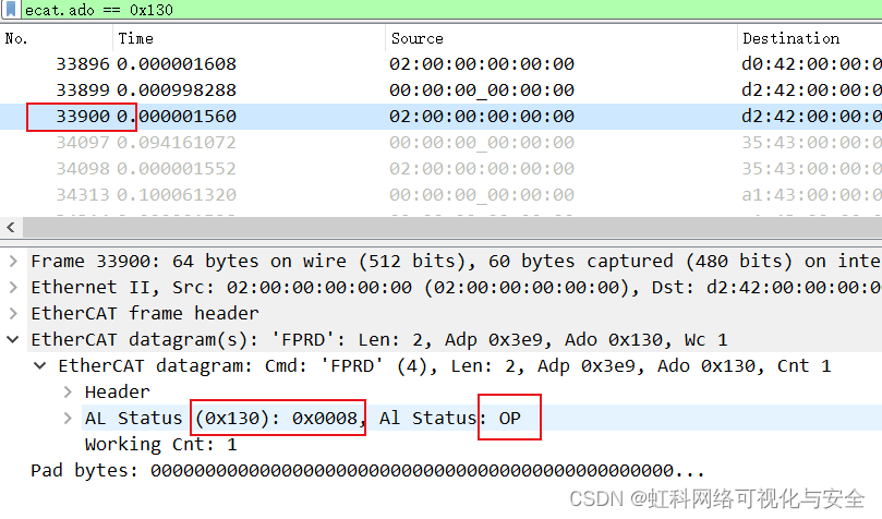 2、 使用ecat.ado == 0x130命令,过滤出从站在第几条报文处进入op状态的,这里是33900,意味着33900前的报文不能用于分析circle time,因为pdo数据/周期性数据只在从站进入op后才被发送