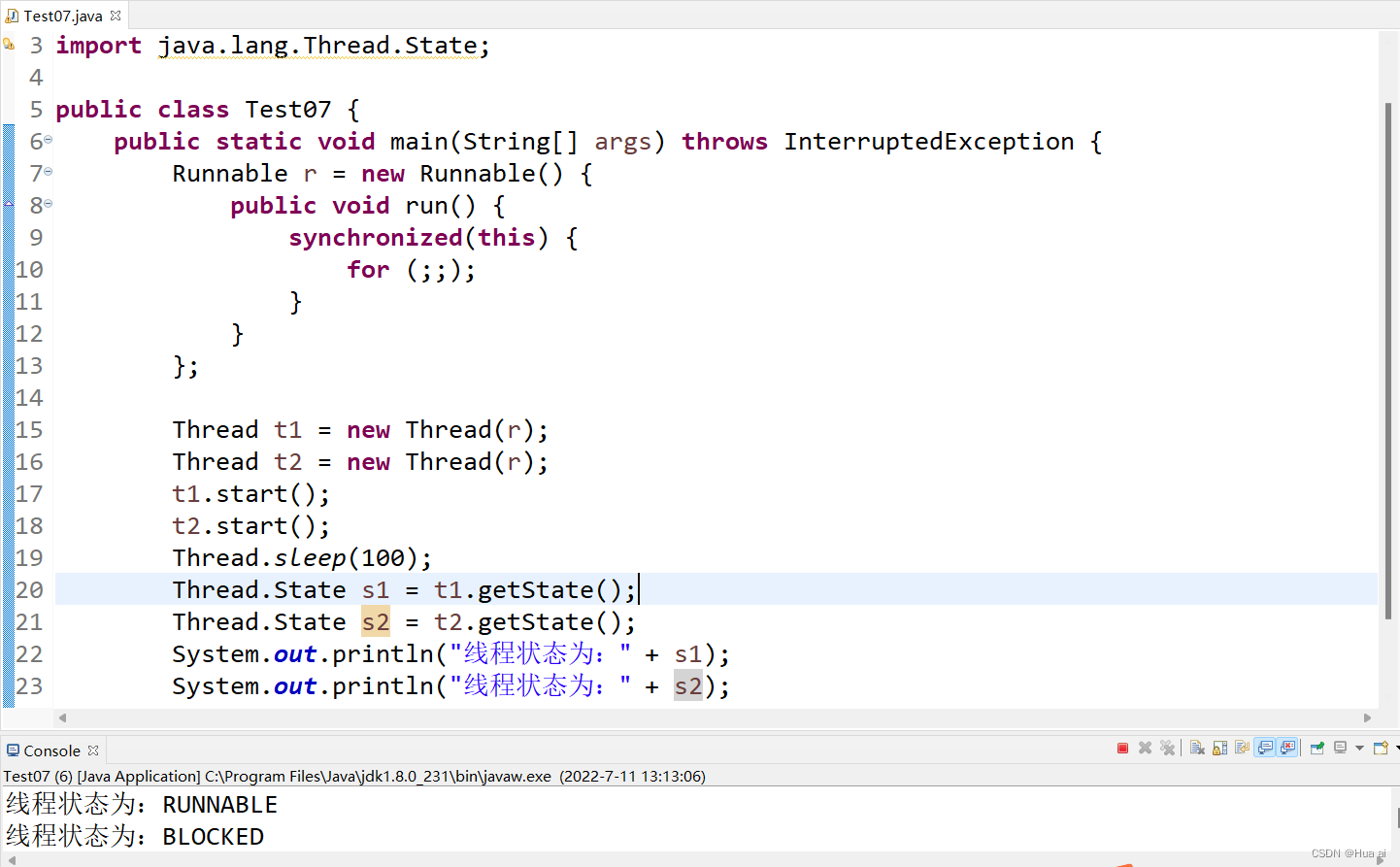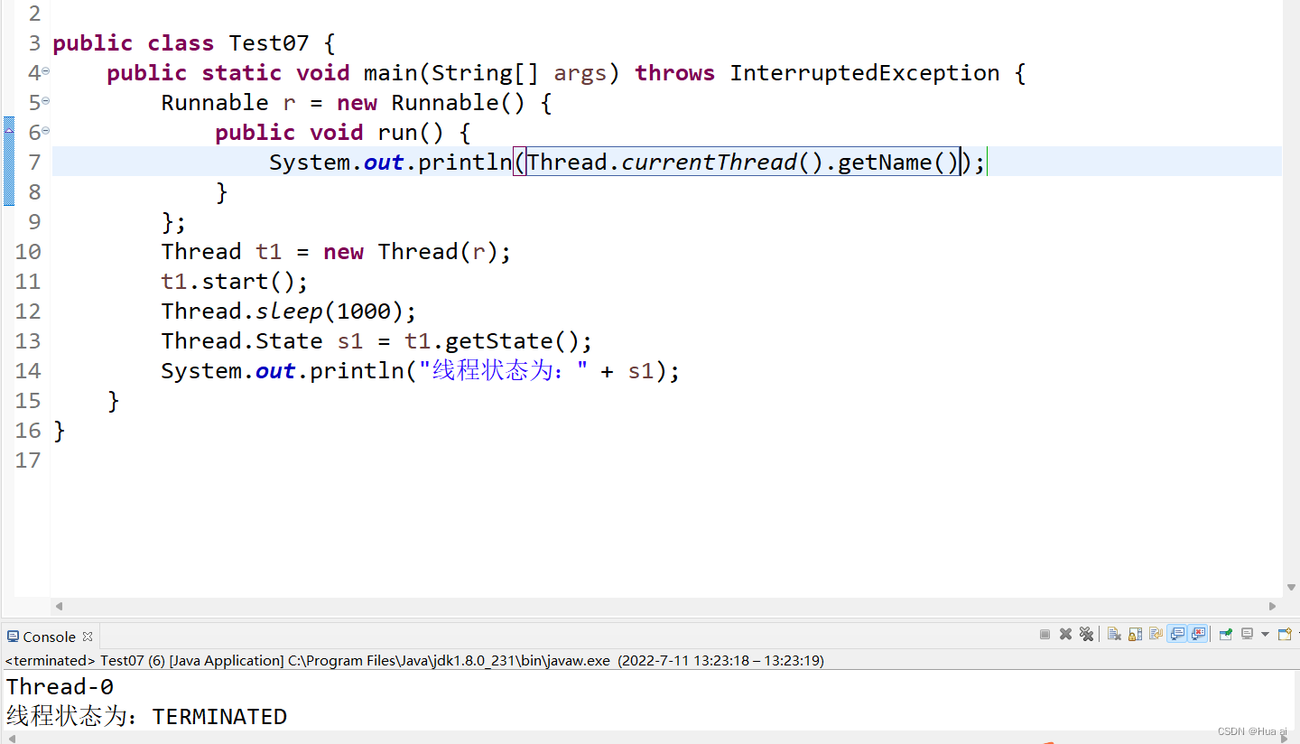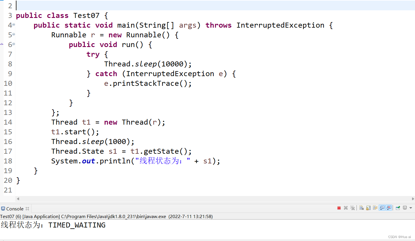 TIMED_WAITING(计时等待状态):线程正在执行sleep方法,或者wait(long mills)。线程就处于该状态。