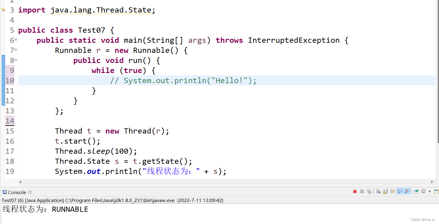 RUNNABLE(可运行状态):线程正在执行该方法(run方法)。线程就处于该状态。