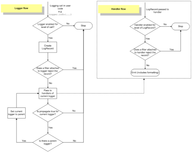 - 在当前Logger对象中查找Handlers,如果找不到任何Handler,则往上到该Logger对象的父Logger中查找;如果找到一个或多个Handler,则依次用Handler来处理日志信息。但在每个Handler处理日志信息过程中,会首先判断日志信息的等级是否大于该Handler的等级,如果大于,则往下执行(由Logger对象进入Handler对象中),否则,处理流程结束。