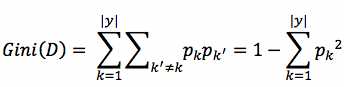 基尼系数也是衡量集合中样本不纯度的一种指标,假设当前集合为D,其中样本类别数为|y|,第k类样本所占的比例为p_k,那么集合D的基尼系数Gini则定义为: