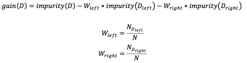 回归决策树中,将节点中包含的所有样本y_i的平均值作为该节点的预测值。该公式直接表示集合D的方差,因此代表该节点预测值与真实值(所有样本)的差距,也就是不纯度impurity。 spark中的实现位于org.apache.spark.mllib.tree.impurity.Variance