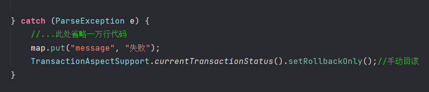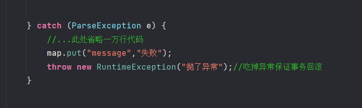 (尽量不要写try-catch 如果要写的同时还要保证事务回滚可以尝试在catch最后一行throw一个runtimeException,类似这样)