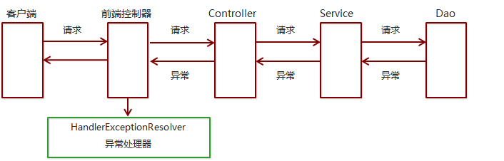 系统的Dao、Service、Controller出现都通过throws Exception向上抛出,最后由SpringMVC前端控制器交由异常处理器进行异常处理,如下图: